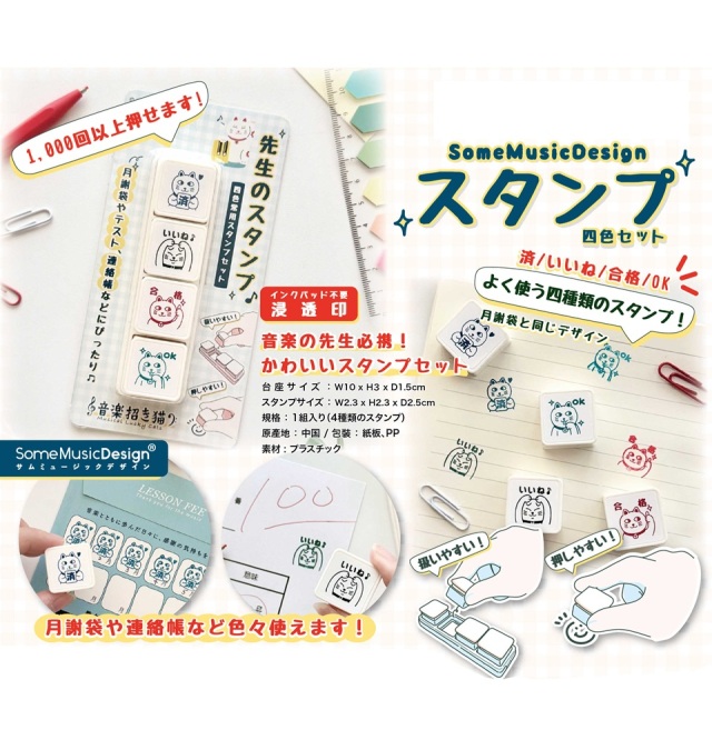 音楽の先生必携!レッスンがもっと楽しくなる「褒め言葉」スタンプセット ピアノ教室や音楽教室の先生、お待たせしました! 「済」「いいね♪」「合格」「OK」という、レッスン現場で最もよく使う4つの言葉が、とってもかわいい音楽モチーフのスタンプになりました。 バッハやベートーヴェンなどの偉人から、キュートな猫やペンギンまで。生徒さんの年齢や好みに合わせて選べるユニークなデザインが魅力です。 ★ここがポイント! インクパッド不要の「浸透印」 スタンプ台は不要!キャップを外してそのままポンポン押せます。忙しいレッスンの合間でも手が汚れず、スムーズに使えます。 カラフルな4色セット 1つのセットで4つの異なる色とデザインが楽しめます。月謝袋、出席カード、宿題のチェックなど、用途に合わせて使い分けが可能です。 長持ち設計 約1,000回以上捺印可能。コストパフォーマンスも抜群です。 収納に便利なケース付き バラバラにならず、ペンケースや引き出しにもスッキリ収まる専用プラケースに入っています。 【こんなシーンで大活躍】 音楽教室・ピアノ教室の先生に: 月謝袋の領収印として、連絡帳の確認印として、テストや宿題の「ご褒美スタンプ」として。 文房具好き・手帳ユーザーの方に: 手帳のToDoリスト消化のチェックに。日記やバレットジャーナルのデコレーションに。音楽好きなお友達へのちょっとしたプレゼントにも最適です。 【セット内容・仕様】 印面内容(4種共通): 済(確認用) いいね♪(称賛用) 合格(評価用) OK(承認用) サイズ: 台座ケース:W10 × H3 × D1.5cm スタンプ本体(1個あたり):W2.3 × H2.3 × D2.5cm 素材: プラスチック、油性顔料インク 生産国: 中国 ブランド: SomeMusicDesign(サムミュージックデザイン)